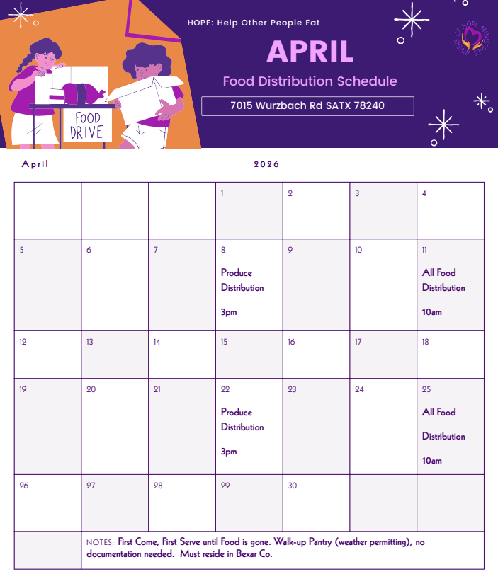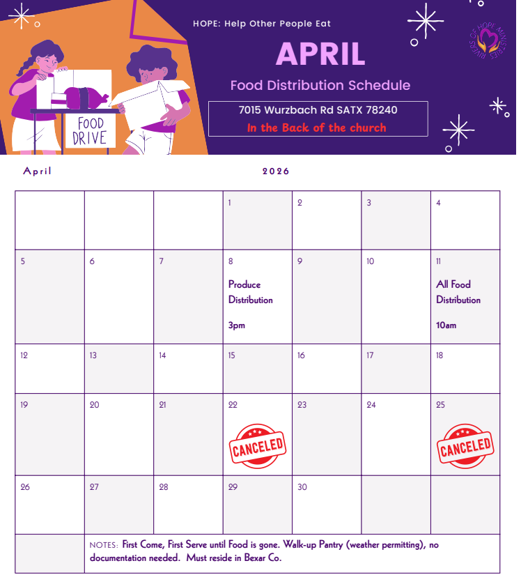 💜 We operate a bi-monthly food pantry— H.O.P.E. (Help Other People Eat) — serving residents of Bexar County. The food pantry is open for All Food Distribution on Saturday of the 2nd and 4th weeks of each month at 10:00am until food runs out. The food pantry is open for Produce Only Distribution on the Wednesday of the 2nd and 4th weeks of each month at 3:00pm until food runs out. We are a walk up pantry and all food is distributed on a first come, first serve basis and no documentation is needed. We accept donations of food, clothing, hygiene products and books to give to those in need.